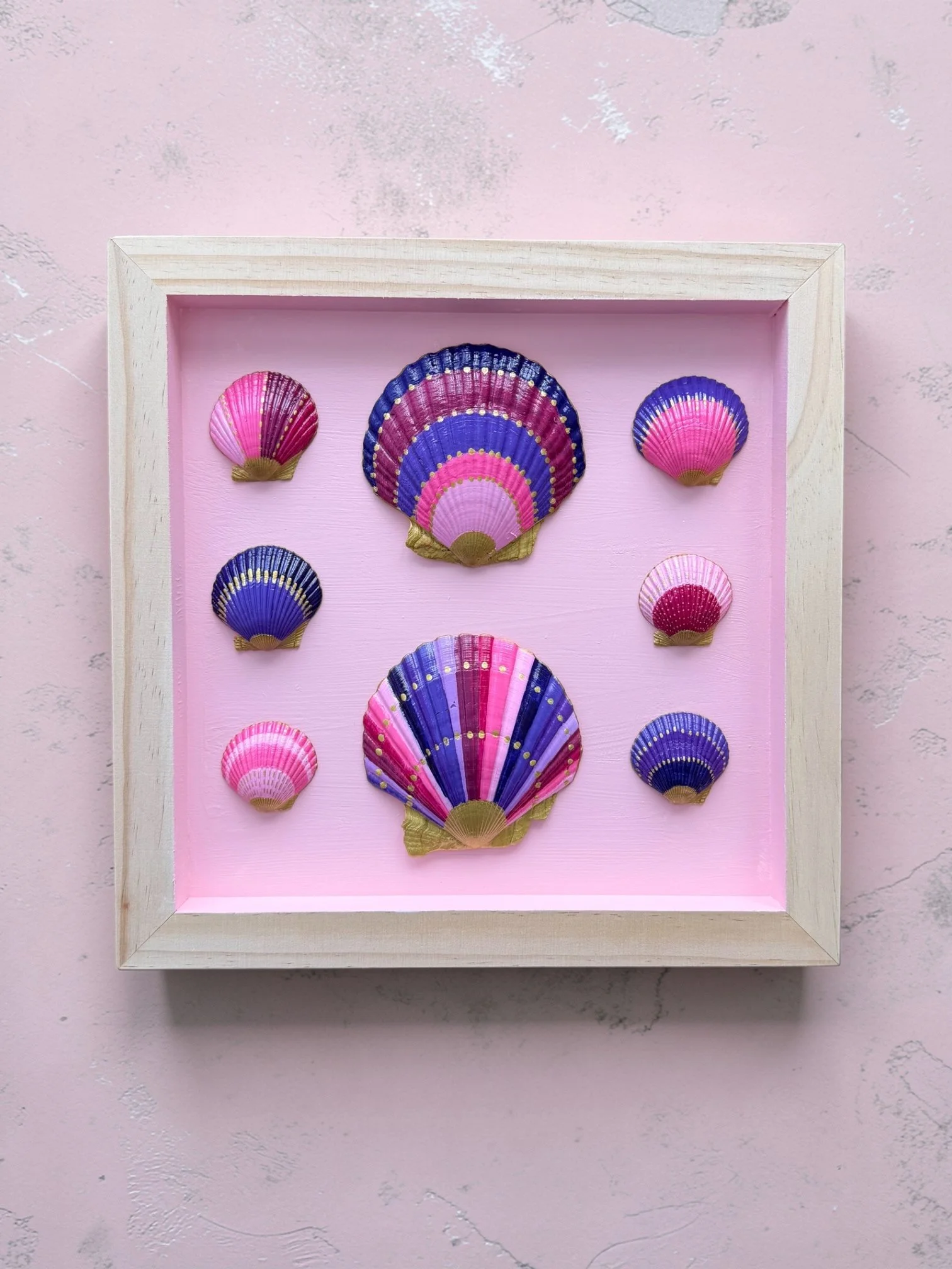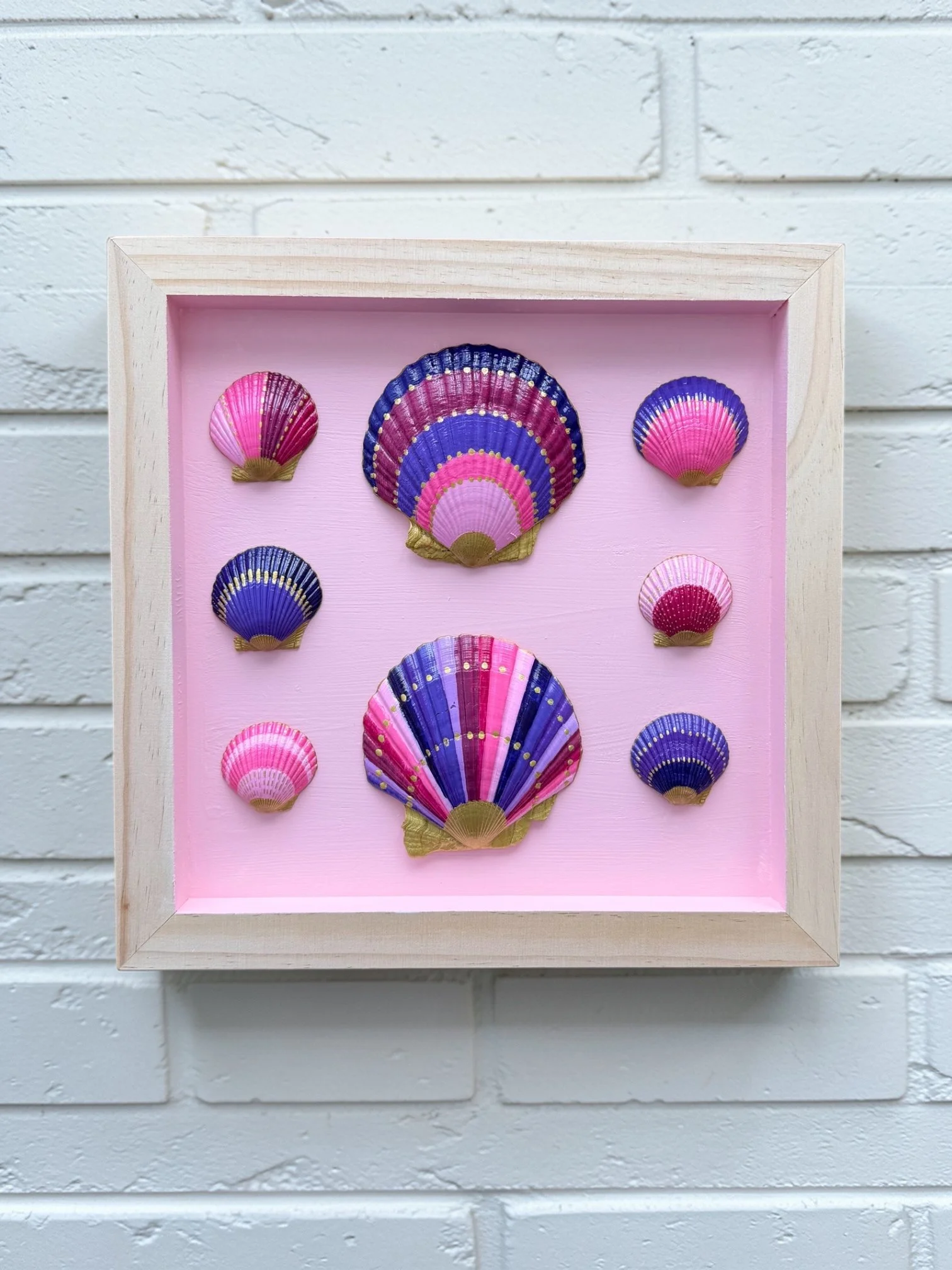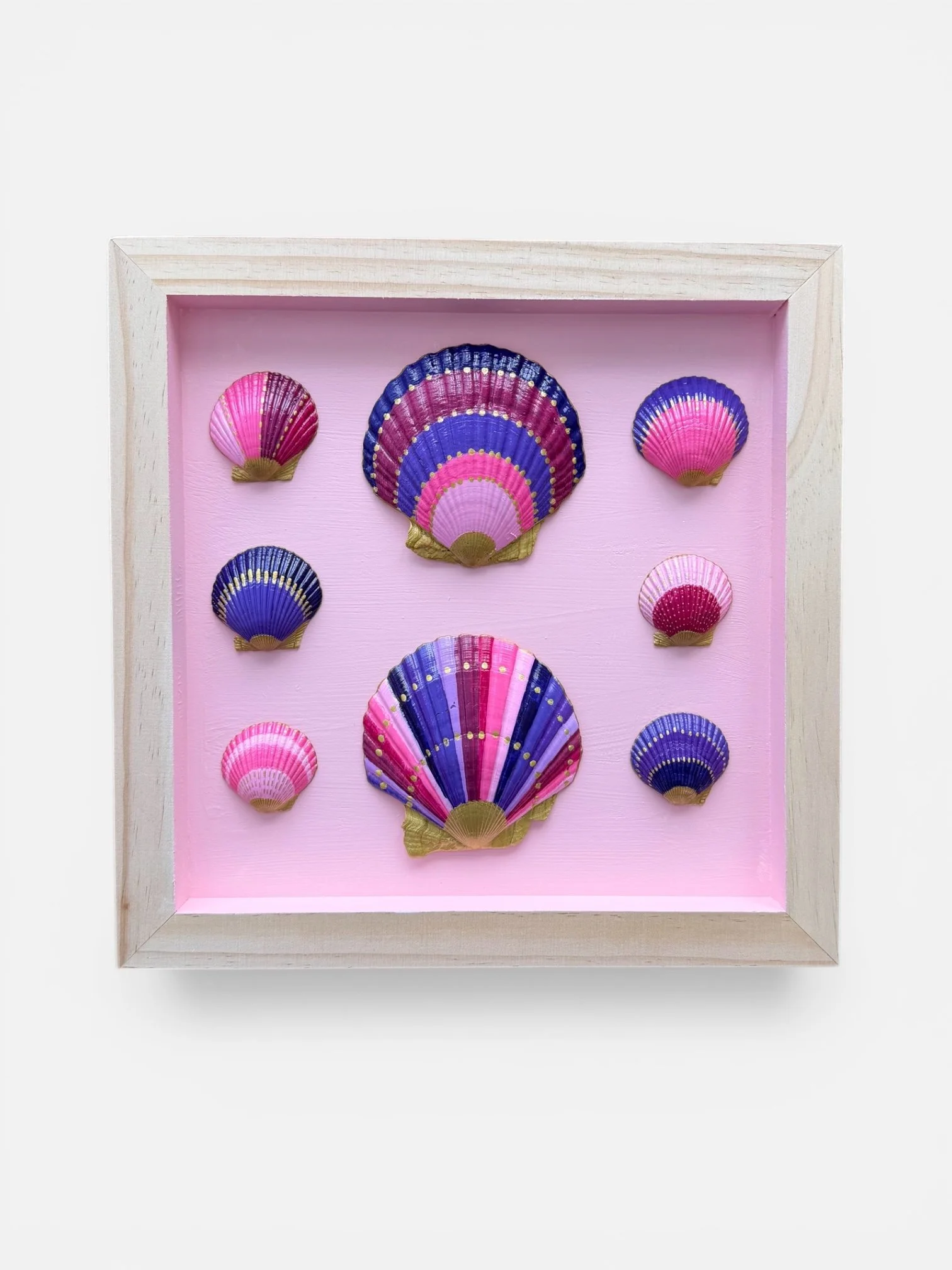 Mermaid Pop is a bold and playful take on coastal art, inspired by the vibrant colours and carefree spirit of the sea. Featuring hand-painted shells in striking pinks, purples, and gold accents, this piece brings energy, personality, and a touch of whimsy into any space.