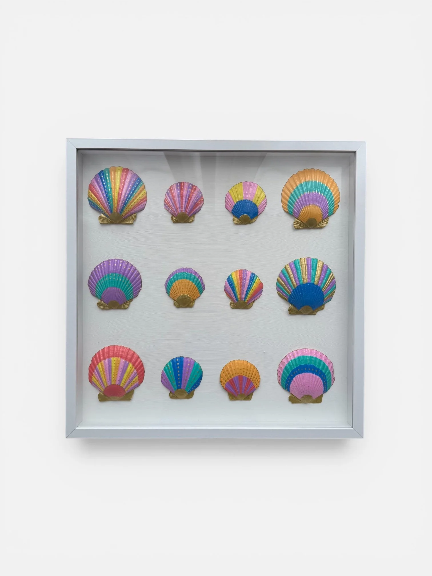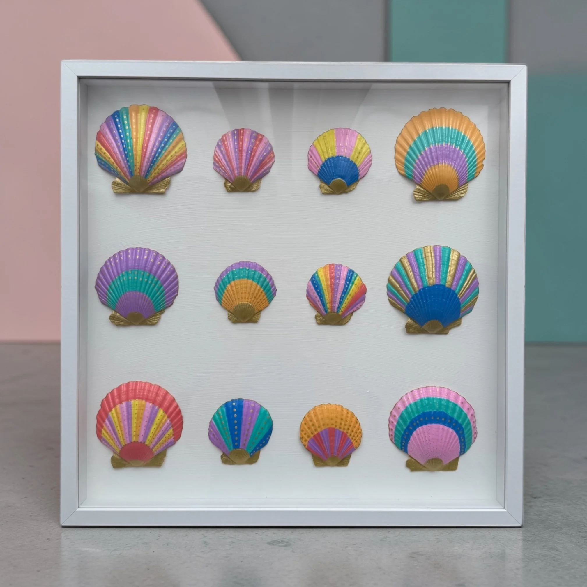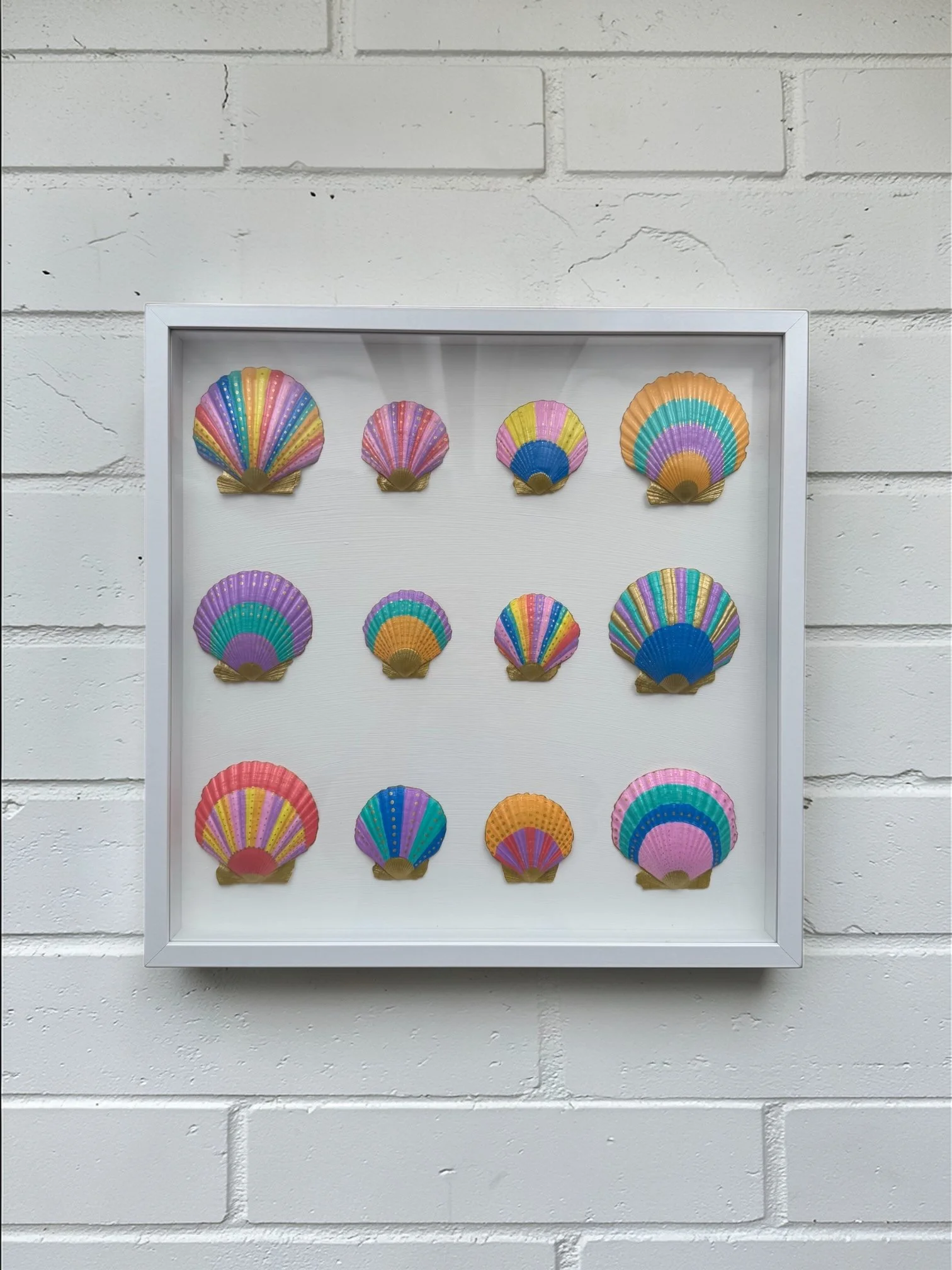 Each shell is individually hand-painted and thoughtfully arranged, creating a unique statement artwork that captures the fun and energy of the ocean in a modern, artistic way.