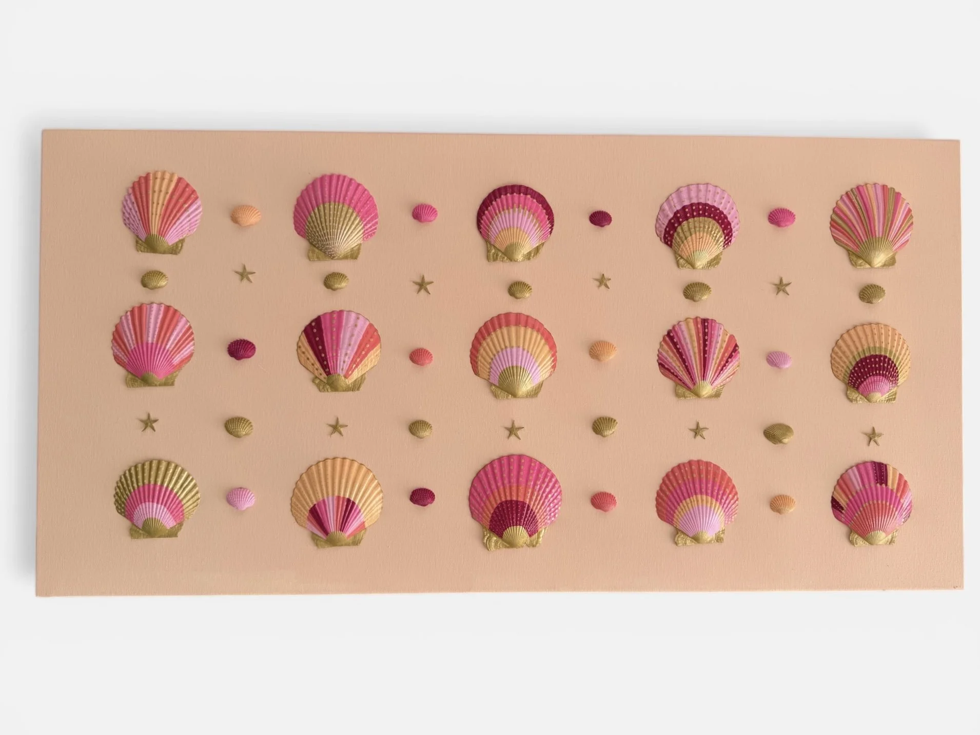 Rosé Tides is a soft and sophisticated coastal artwork inspired by the warm hues of golden hour. Featuring a structured arrangement of hand-painted shells in blush, coral, and pink tones, this piece brings a sense of harmony, warmth, and understated elegance.